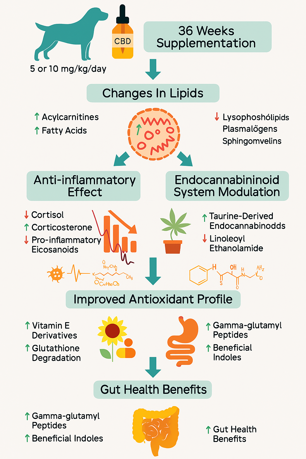 El CBD altera profundamente el metabolismo de los perros sanos tras 36 semanas de suplementación, según un estudio de la Universidad Estatal de Colorado. Los efectos incluyen cambios en lípidos, inflamación, antioxidantes y salud intestinal, con implicaciones para la medicina veterinaria preventiva.